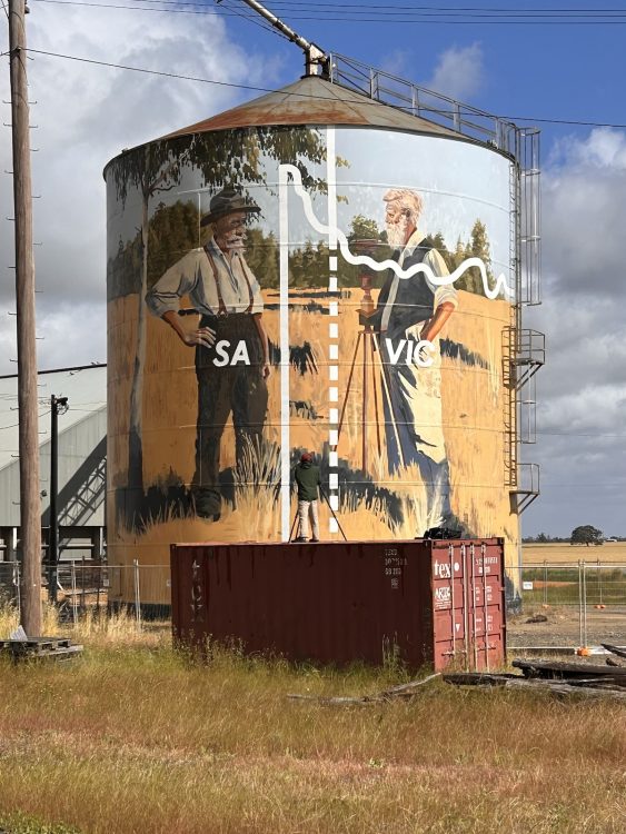 Jack has plenty more going on at the moment, too. He’s just finished a silo in a town called Serviceton, just on the border of SA and Victoria. “The artwork is about a border dispute, about a disputed territory. When they were marking out the border, they actually got it wrong, so this town was meant to be in SA, and they got it wrong. So that’s what that artwork is about.”