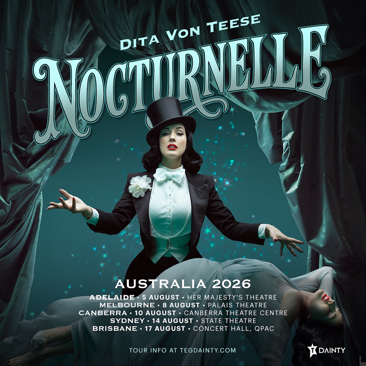 Following her record-breaking Glamonatrix Tour—the biggest touring burlesque show in history—Dita returns to Australian stages with a production that promises to be even more opulent. Nocturnelle is a glittering fusion of sophisticated vintage stage magic, an exquisite blend of old-Hollywood allure, theatrical magic, and the high-art “Stripscapes” Dita is known for, inspired by 19th-century magicians and wrapped in the allure of Dita’s unmistakable style.