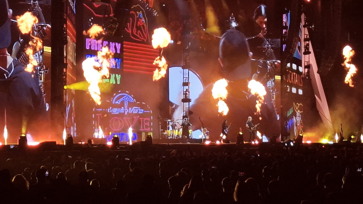 As old photos sprawled across the enormous screens, and the flywire camera moved around the venue, filming impassioned metal devotees, the tension was building for the thrash metal titans, Metallica. AC/DC’s ‘It’s a Long Way to the Top (If You Wanna Rock ‘n’ Roll)’ heightened the frenzy, inspiring an oval-wide Mexican wave. This was brought to a halt when a scene from the film The Good, The Bad, The Ugly lit up the backdrop screens – pandemonium, was about to commence.