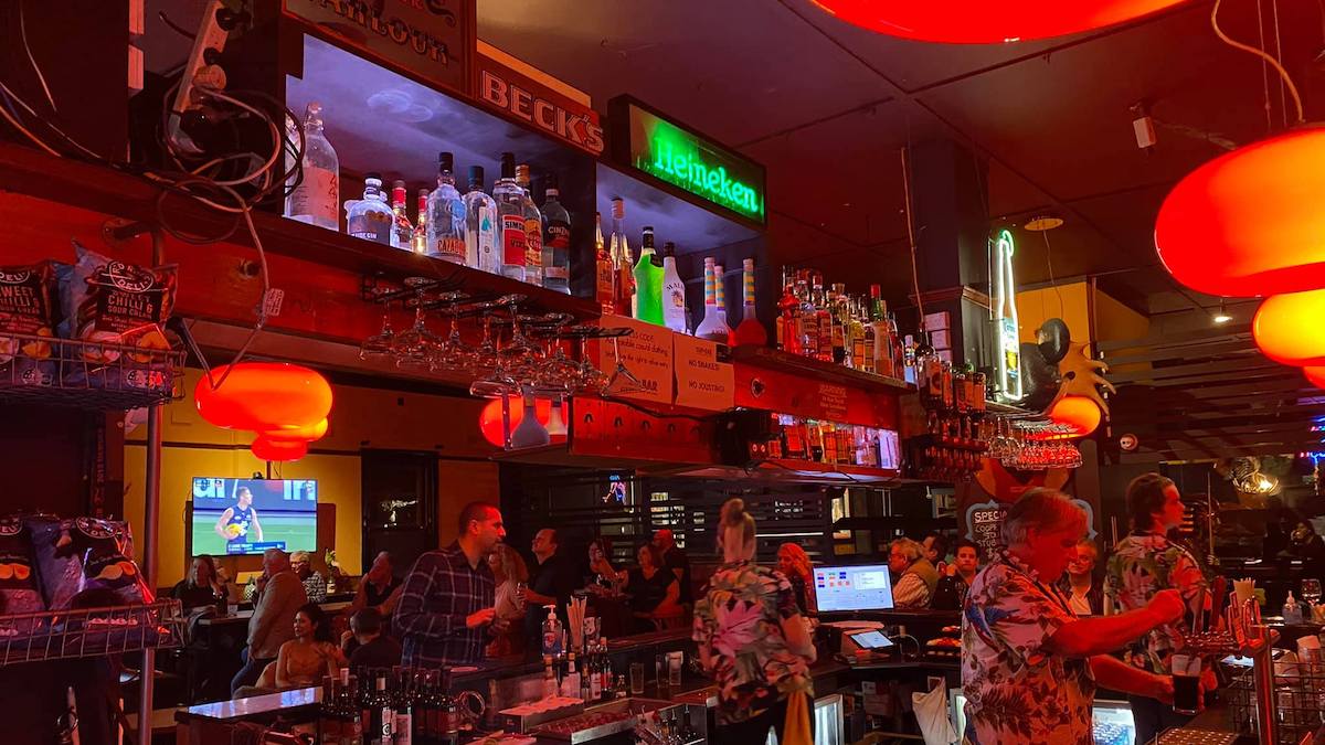Bar tenders wearing Hawaiian shirts serve all the drinks and cocktails you could want at affordable prices, while a juke box with 12,000 songs invites you to take a pick.
