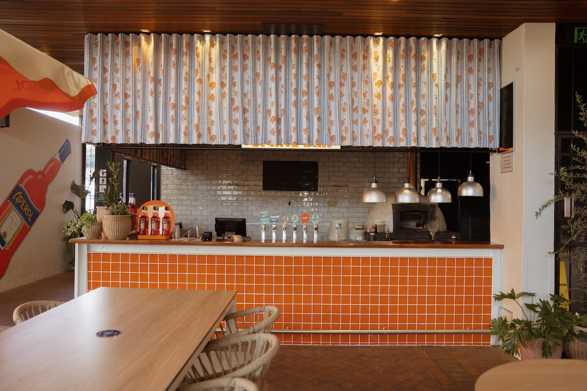 The transformation is every bit the Mediterranean dream. Warm terracotta tiles run across the outdoor bar, custom spritz taps gleam under the afternoon sun, and comfortable booths with duck-egg blue cushions sit beneath walls splashed in Aperol’s trademark orange. The tables are now tiled and glistening, and oversized Aperol and Campari murals by local artist Billie Justice Thompson make the space just belissima.
