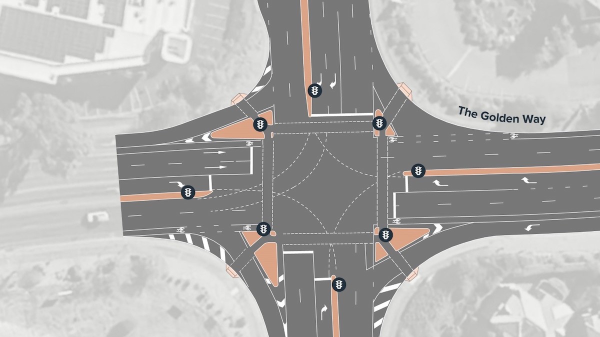 The intersection of The Grove Way and The Golden Way saw the introduction of an extra right turn lane for westbound traffic, alongside comparable upgrades in signals, phasing, line markings, ramp adjustments, and enhanced lighting conditions.